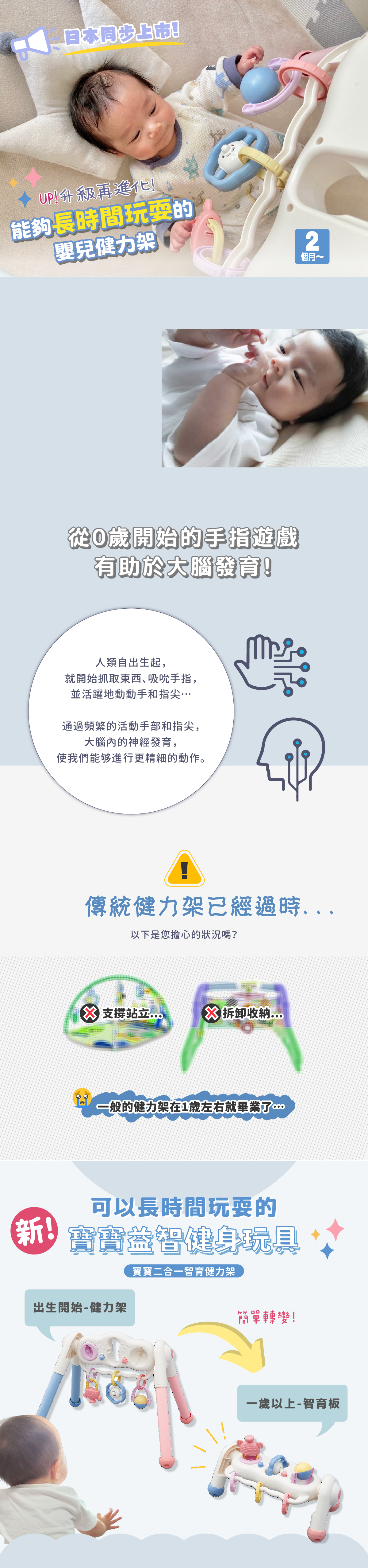 ① 二合一智育健力架可作「健力架」和「智育板」,適合不同階段的嬰兒使用,可以玩更久。